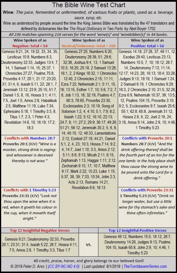 2. When reviewing every instance of the term wine(s) and winebibber(s) in the Bible, there is without question a conflict unless more than one type of wine is being spoken of. See The Bible Wine Test Chart and corresponding document The Bible Wine Definition Test.